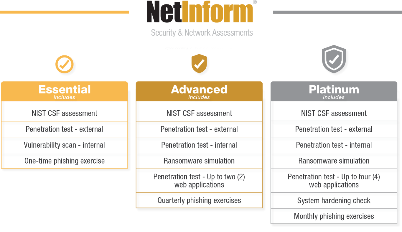 Our NetInform offering has three standard packages with assessment tests and solutions increasing at each subsequent level — or clients can customize it based on an organization’s specific needs.